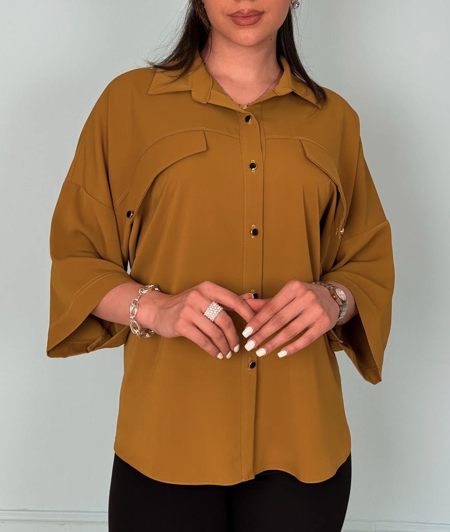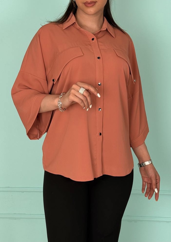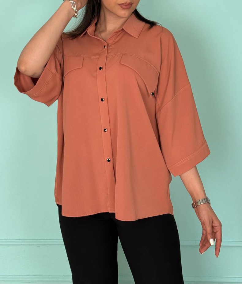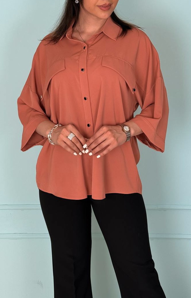تونیک بلند جلو دکمه فری سایز کهاز پارچه الیزا تهیه شده که لطافت و زیبایی خاصی دارد. حالت آستین کیمونو این مدل باعث میشود به راحتی با هر مدل شلوار و دامن ست شود